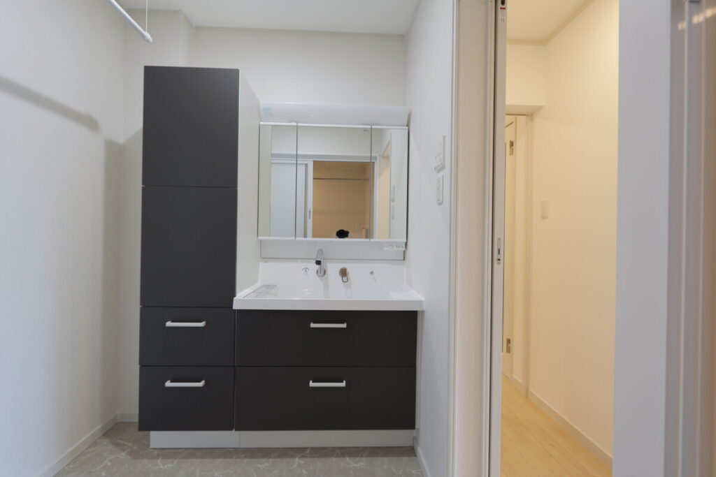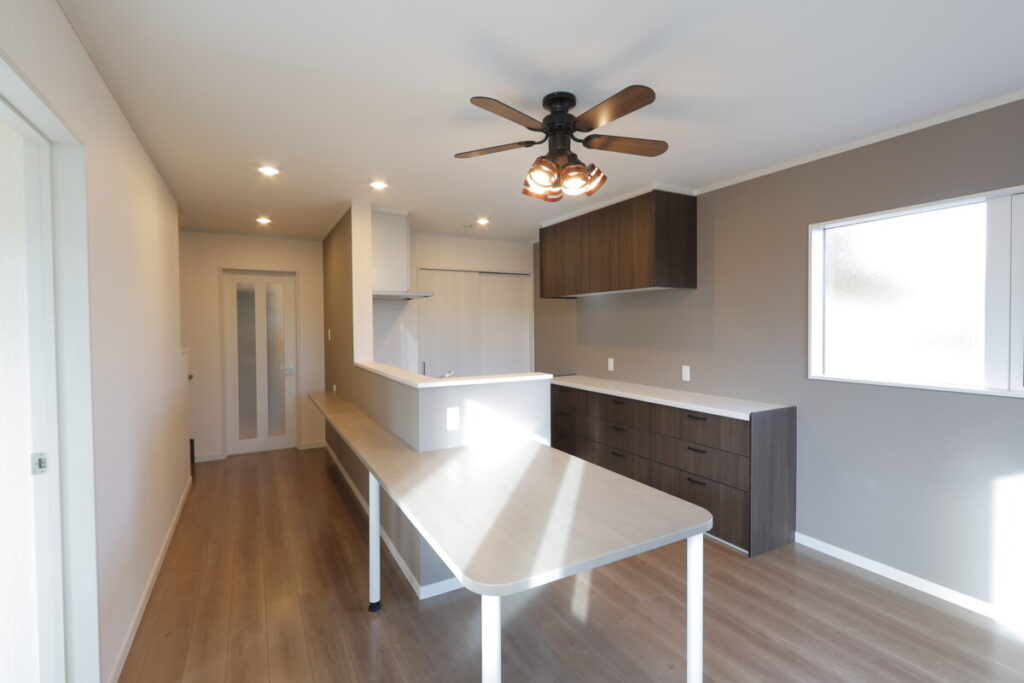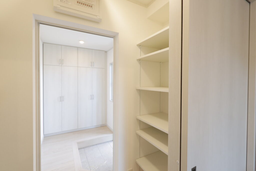 玄関からすぐ入ってパントリーがあり便利な間取りです。パントリー横はキッチンになっており、非常に使いやすい動線です。