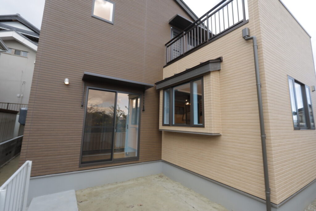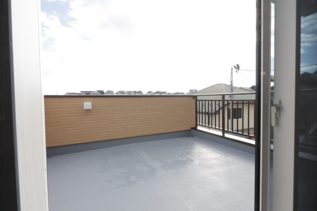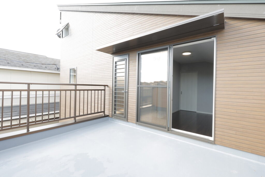 寝室から繋がるバルコニー。バーベキューもできる広さを確保しています。